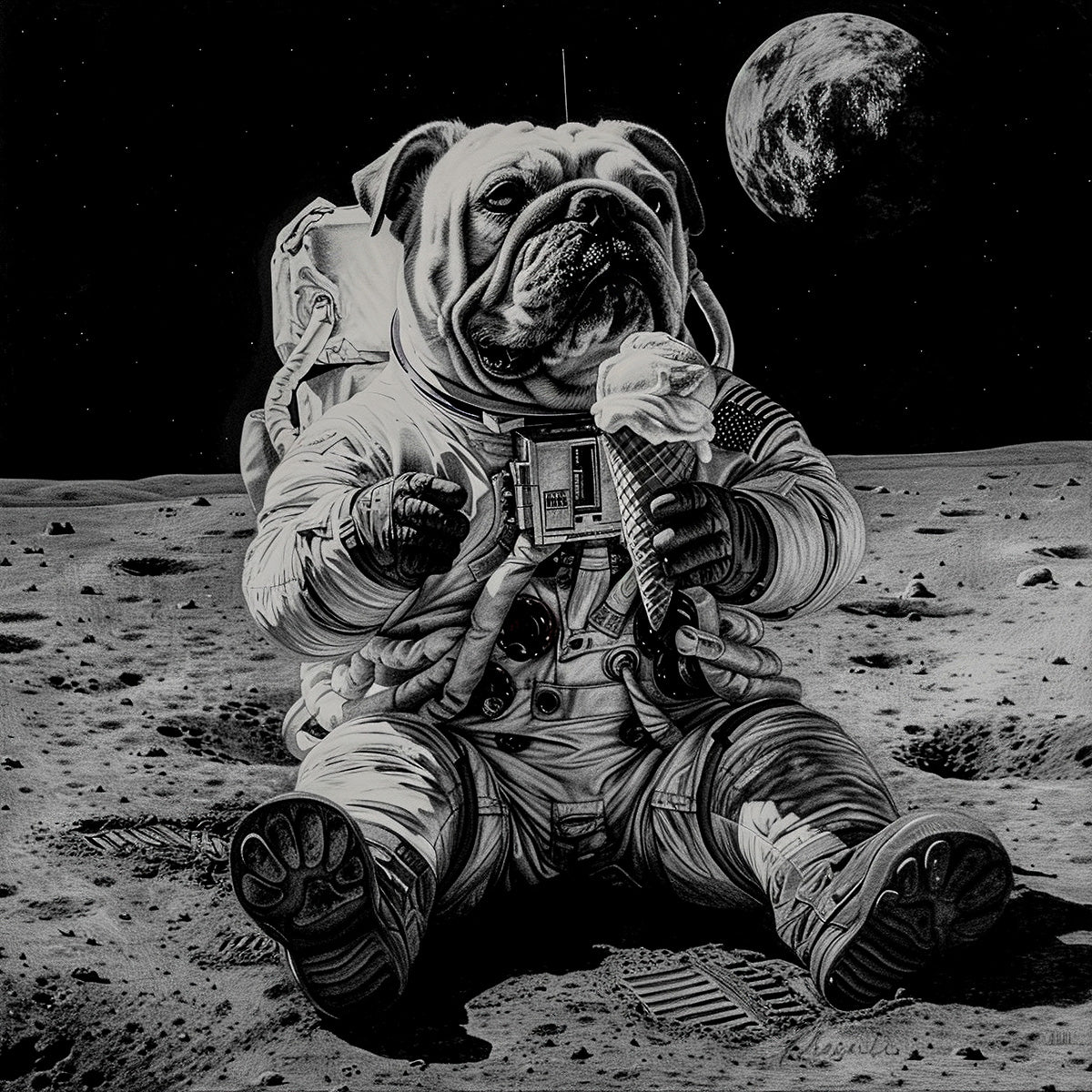 This original piece features a Bulldog sitting on the moon in astronaut attire with an ice cream cone.